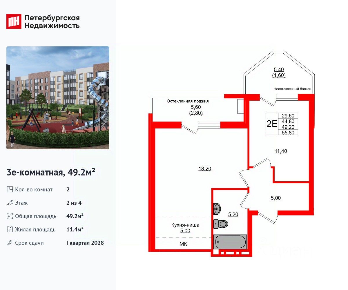 Удобная, классическая, функциональная европланировка, большая кухня-гостиная 23.2 м², вместительная прихожая 5 м². Общая площадь квартиры - 49.2 м², жилая 11.4 м², высота потолка 2.7 м.