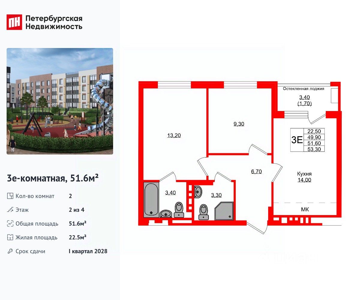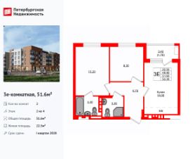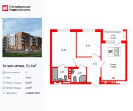 Удобная, классическая, функциональная европланировка, большая кухня-гостиная 14 м², вместительная прихожая 6.7 м². Общая площадь квартиры - 51.6 м², жилая 22.5 м², высота потолка 2.7 м.