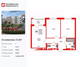 Удобная, классическая, функциональная европланировка, большая кухня-гостиная 14 м², вместительная прихожая 6.6 м². Общая площадь квартиры - 51.9 м², жилая 23.8 м², высота потолка 3 м.