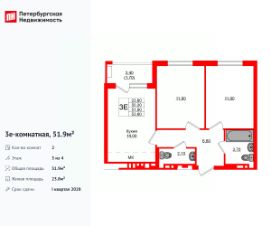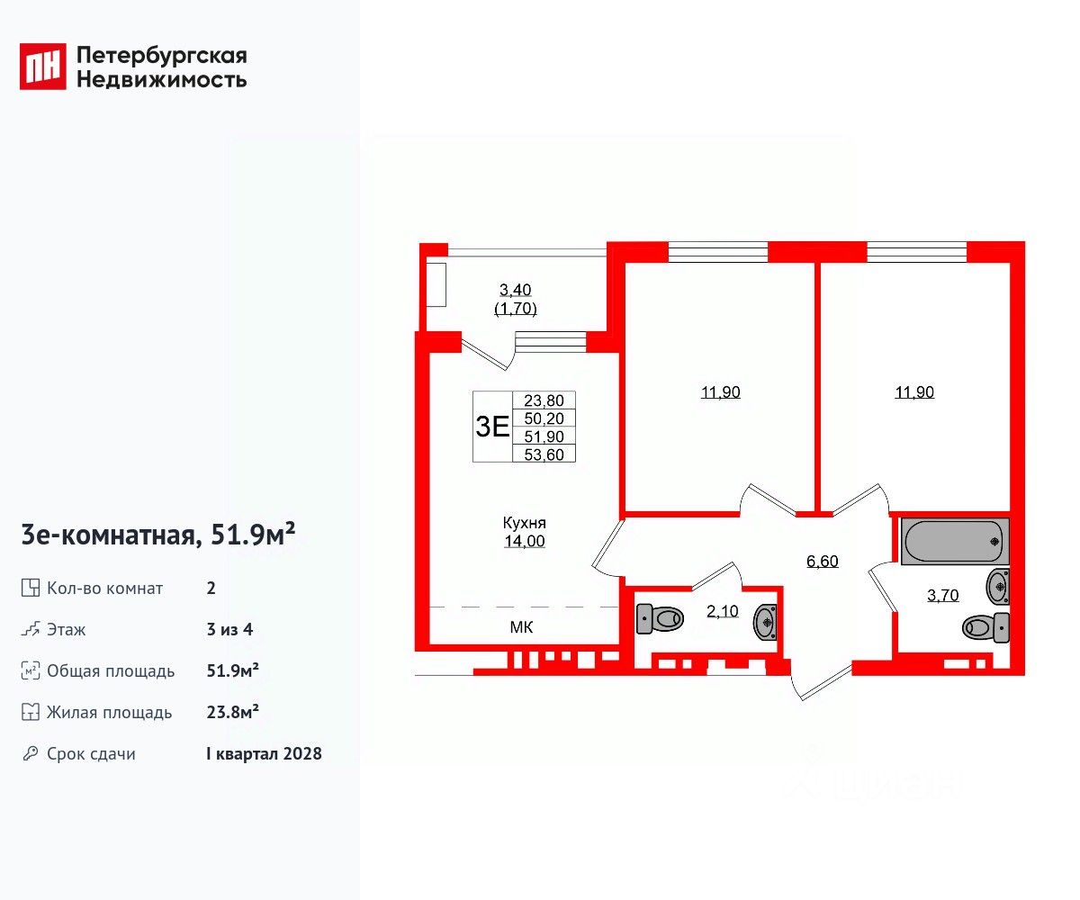 Удобная, классическая, функциональная европланировка, большая кухня-гостиная 14 м², вместительная прихожая 6.6 м². Общая площадь квартиры - 51.9 м², жилая 23.8 м², высота потолка 2.7 м.