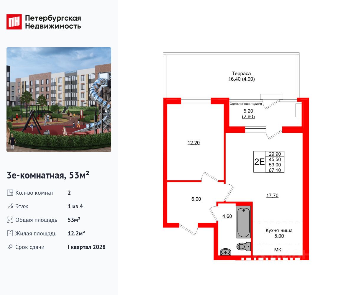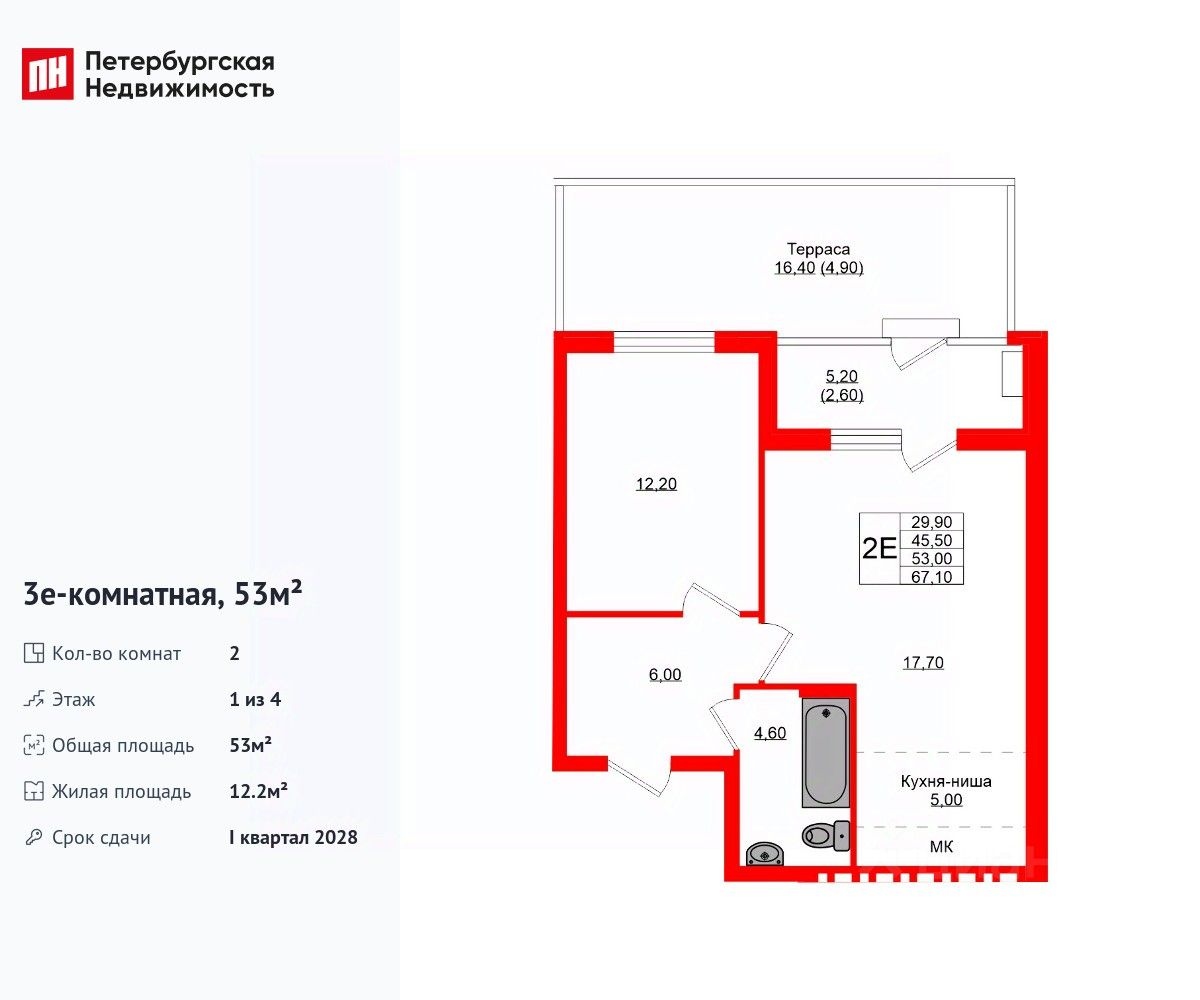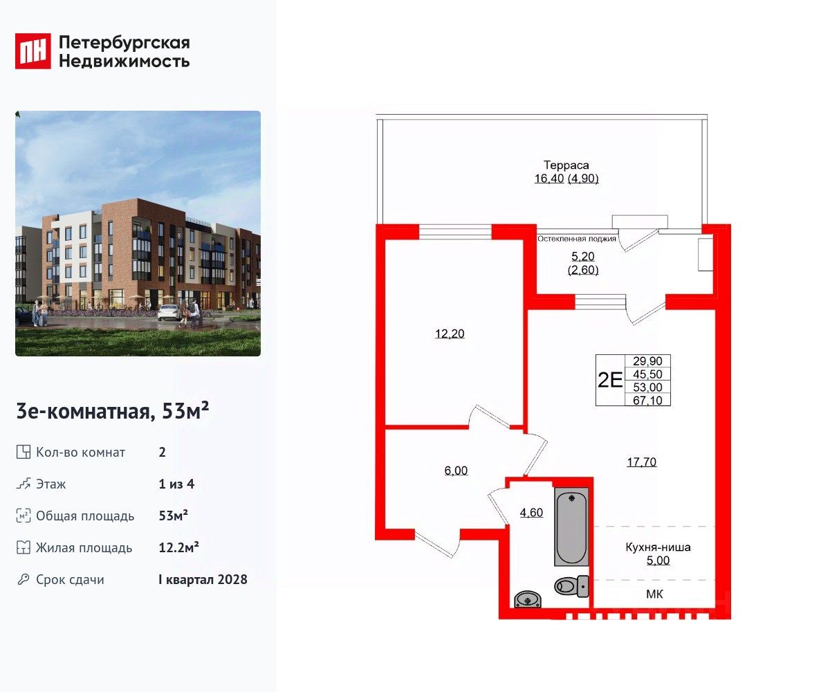Удобная, классическая, функциональная европланировка, большая кухня-гостиная 17.7 м², вместительная прихожая 6 м². Общая площадь квартиры - 53 м², жилая 12.2 м², высота потолка 2.7 м.