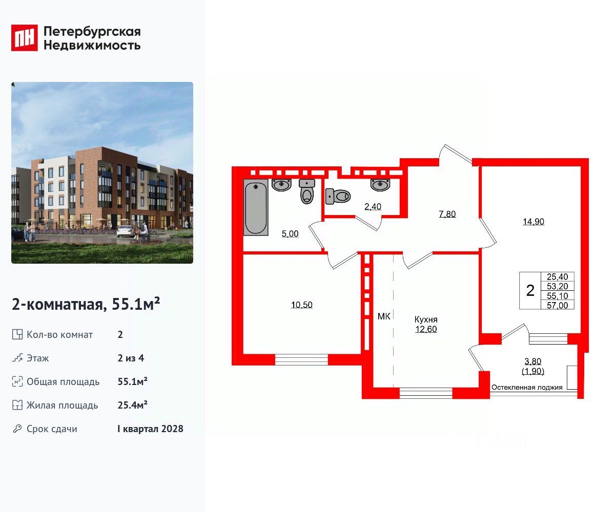 Удобная, классическая планировка, кухня 12.6 м², просторная прихожая 7.8 м². Общая площадь квартиры - 55.1 м², жилая 25.4 м², высота потолка 2.7 м.