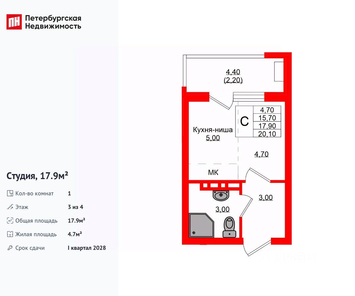 Удобная, классическая, функциональная европланировка, большая кухня-гостиная 5 м², вместительная прихожая 3 м². Общая площадь студии - 17.9 м², жилая 4.7 м², высота потолка 2.7 м.