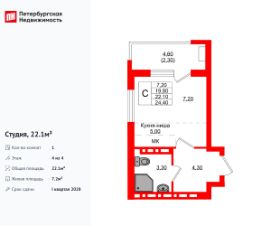 Удобная, классическая, функциональная европланировка, большая кухня-гостиная 5 м², просторная прихожая 4.3 м². Общая площадь студии - 22.1 м², жилая 7.2 м², высота потолка 3 м.
