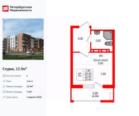 Удобная, классическая, функциональная европланировка, большая кухня-гостиная 5 м², просторная прихожая 4 м². Общая площадь студии - 22.9 м², жилая 7.6 м², высота потолка 2.7 м.