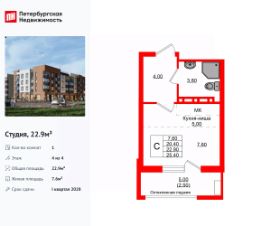 Удобная, классическая, функциональная европланировка, большая кухня-гостиная 5 м², просторная прихожая 4 м². Общая площадь студии - 22.9 м², жилая 7.6 м², высота потолка 3 м.