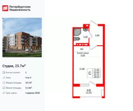 Удобная, классическая, функциональная европланировка, большая кухня-гостиная 5 м², просторная прихожая 3.8 м². Общая площадь студии - 25.7 м², жилая 11.4 м², высота потолка 3 м.