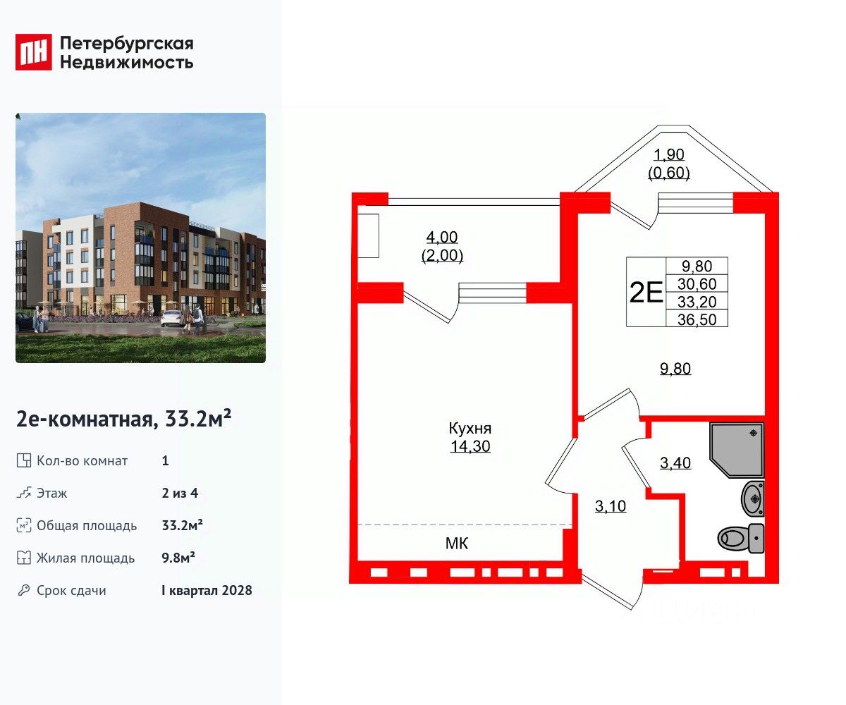 Удобная, классическая, функциональная европланировка, большая кухня-гостиная 14.3 м², вместительная прихожая 3.1 м². Общая площадь квартиры - 33.2 м², жилая 9.8 м², высота потолка 2.7 м.