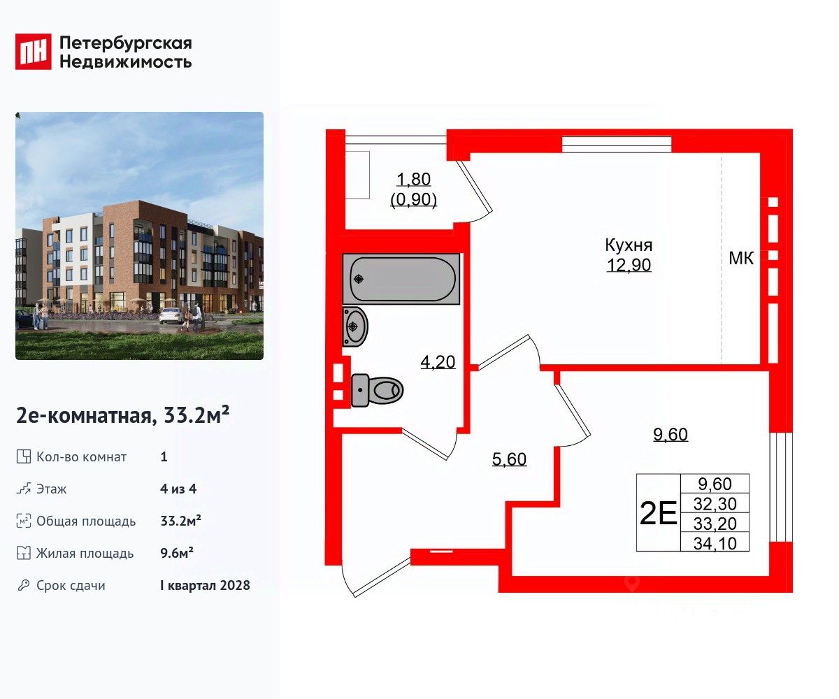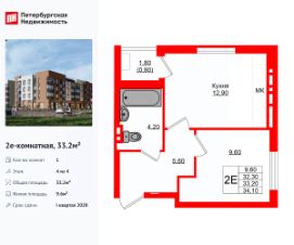 Удобная, классическая, функциональная европланировка, большая кухня-гостиная 12.9 м², просторная прихожая 5.6 м². Общая площадь квартиры - 33.2 м², жилая 9.6 м², высота потолка 3 м.