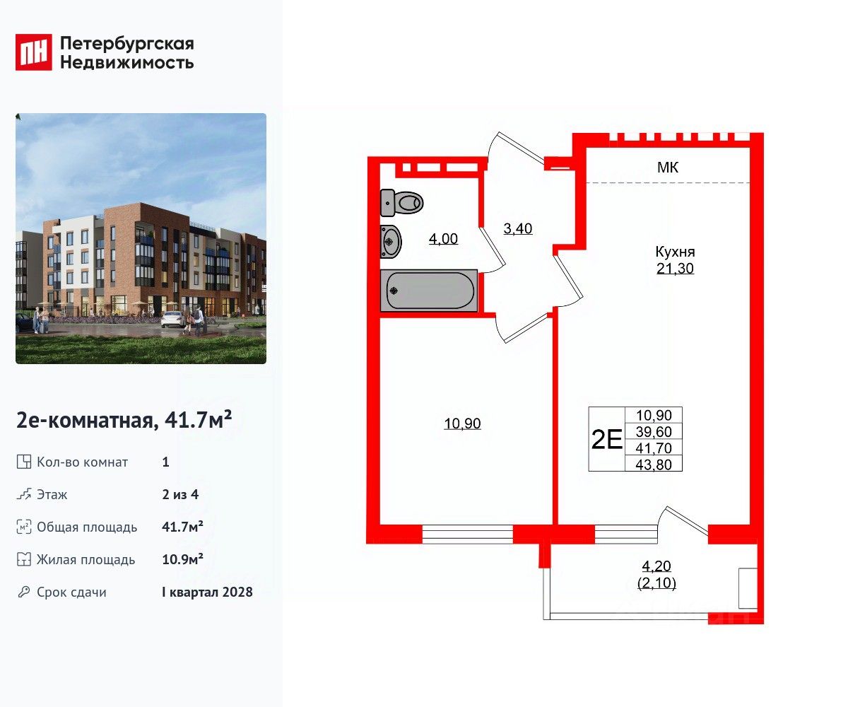 Удобная, классическая, функциональная европланировка, большая кухня-гостиная 21.3 м², вместительная прихожая 3.4 м². Общая площадь квартиры - 41.7 м², жилая 10.9 м², высота потолка 2.7 м.