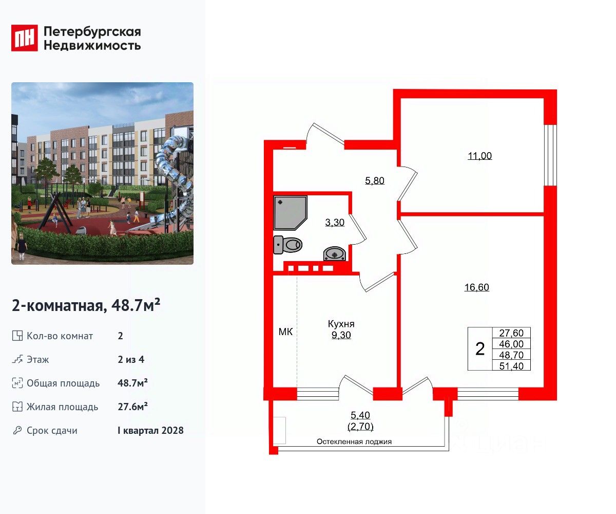 Удобная, классическая планировка, кухня 9.3 м², вместительная прихожая 5.8 м². Общая площадь квартиры - 48.7 м², жилая 27.6 м², высота потолка 2.7 м.