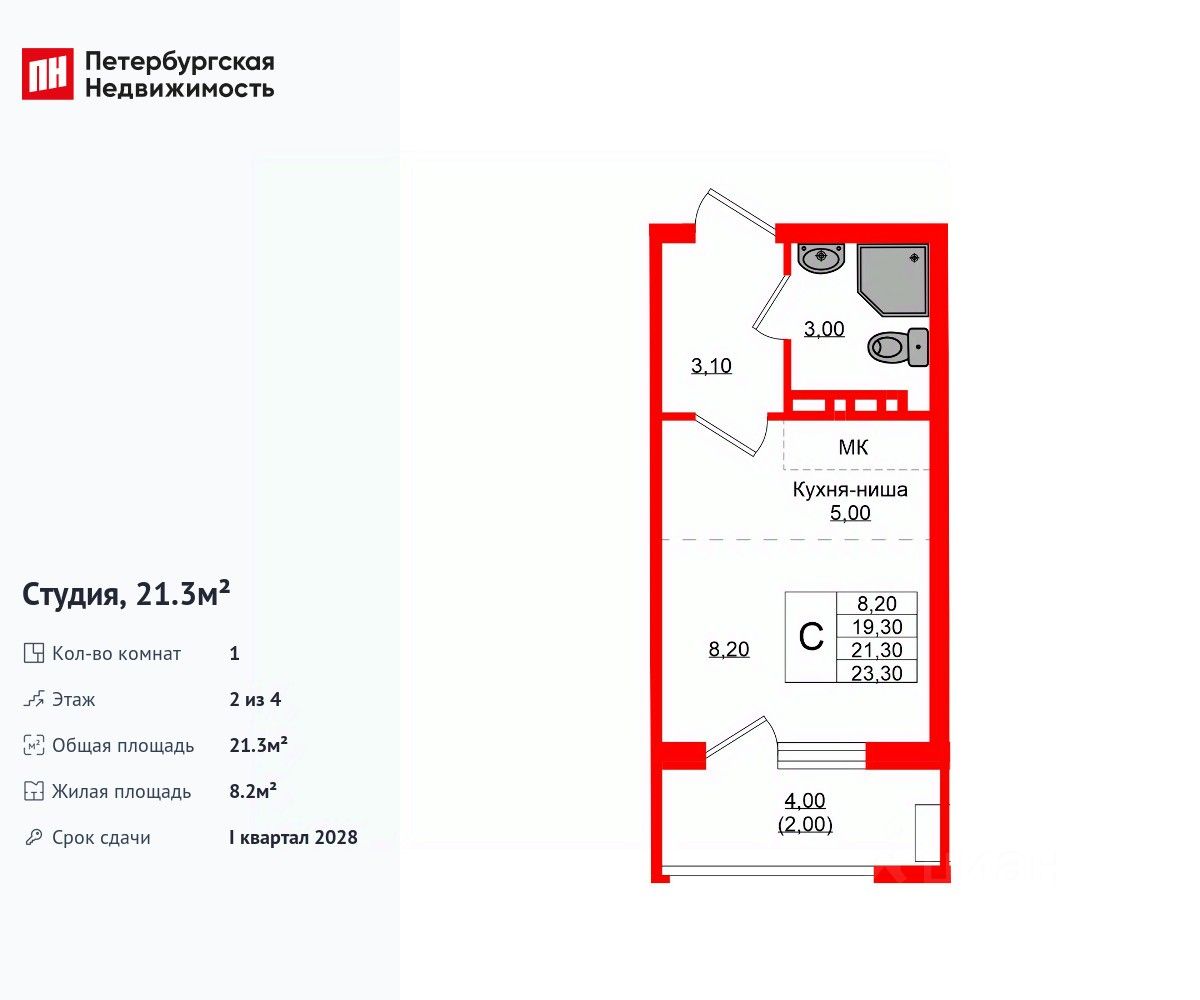 Удобная, классическая, функциональная европланировка, большая кухня-гостиная 5 м², вместительная прихожая 3.1 м². Общая площадь студии - 21.3 м², жилая 8.2 м², высота потолка 2.7 м.