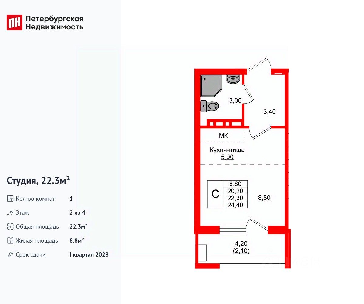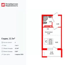 Удобная, классическая, функциональная европланировка, большая кухня-гостиная 5 м², просторная прихожая 3.4 м². Общая площадь студии - 22.3 м², жилая 8.8 м², высота потолка 2.7 м.