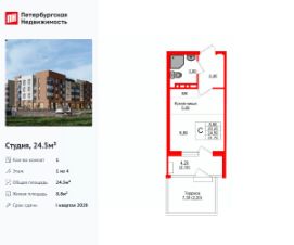 Удобная, классическая, функциональная европланировка, большая кухня-гостиная 5 м², просторная прихожая 3.4 м². Общая площадь студии - 24.5 м², жилая 8.8 м², высота потолка 2.7 м.
