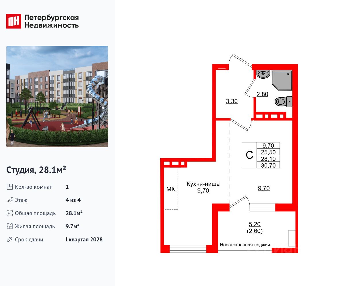 Удобная, классическая, функциональная европланировка, большая кухня-гостиная 9.7 м², просторная прихожая 3.3 м². Общая площадь студии - 28.1 м², жилая 9.7 м², высота потолка 3 м.