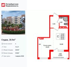 Удобная, классическая, функциональная европланировка, большая кухня-гостиная 10 м², просторная прихожая 3.3 м². Общая площадь студии - 28.9 м², жилая 10.8 м², высота потолка 2.7 м.