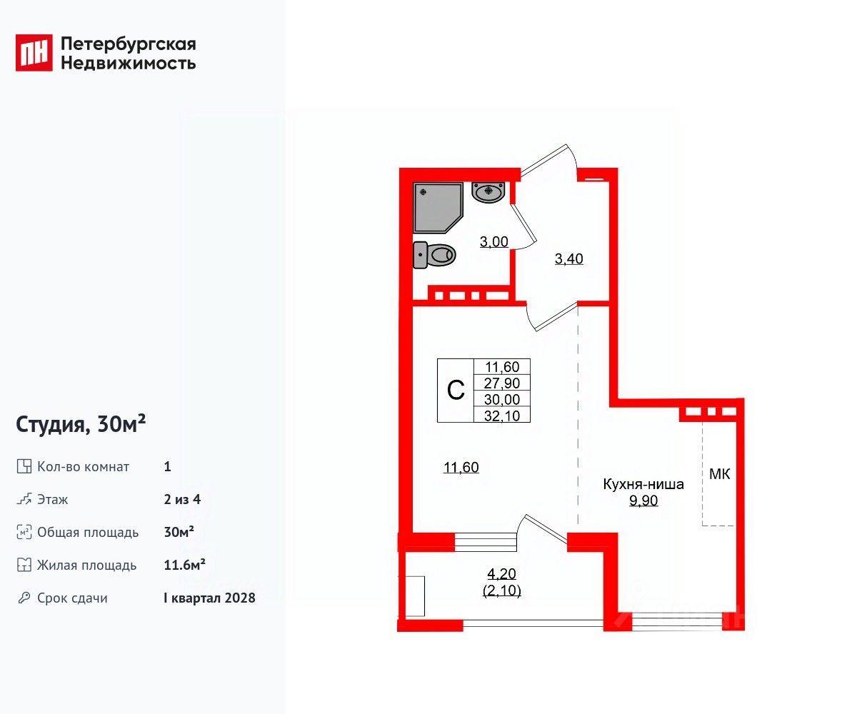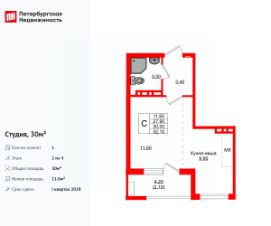 Удобная, классическая, функциональная европланировка, большая кухня-гостиная 9.9 м², просторная прихожая 3.4 м². Общая площадь студии - 30 м², жилая 11.6 м², высота потолка 2.7 м.
