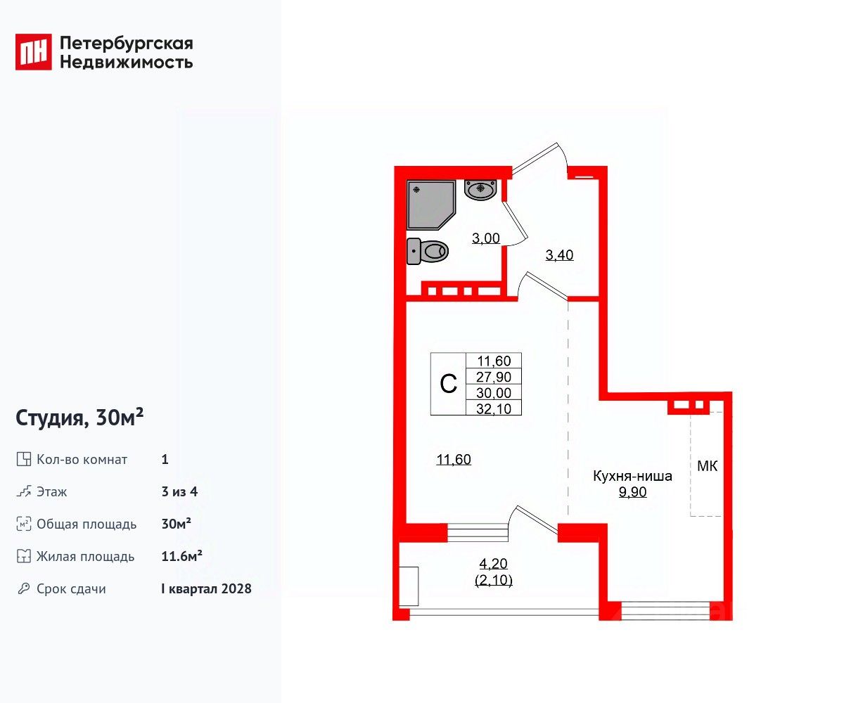 Удобная, классическая, функциональная европланировка, большая кухня-гостиная 9.9 м², просторная прихожая 3.4 м². Общая площадь студии - 30 м², жилая 11.6 м², высота потолка 2.7 м.