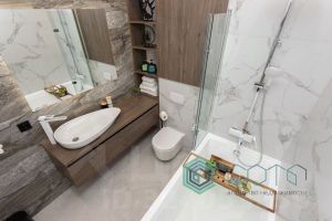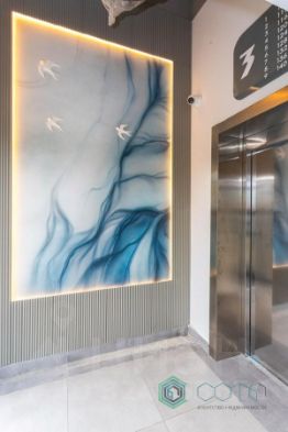 Стены окрашены антивандальной краской. Отопление квартиры индивидуальное, от двухконтурного газового котла, установленного в кухне. Котел также обеспечивает нагрев воды. В качестве нагревательных приборов используются стальные панельные радиаторы. В ванной комнате установлен полотенцесушитель с терморегулятором. В квартире установлен кондиционер и тёплый пол. Используются различные световые решения. Панорамное остекление.