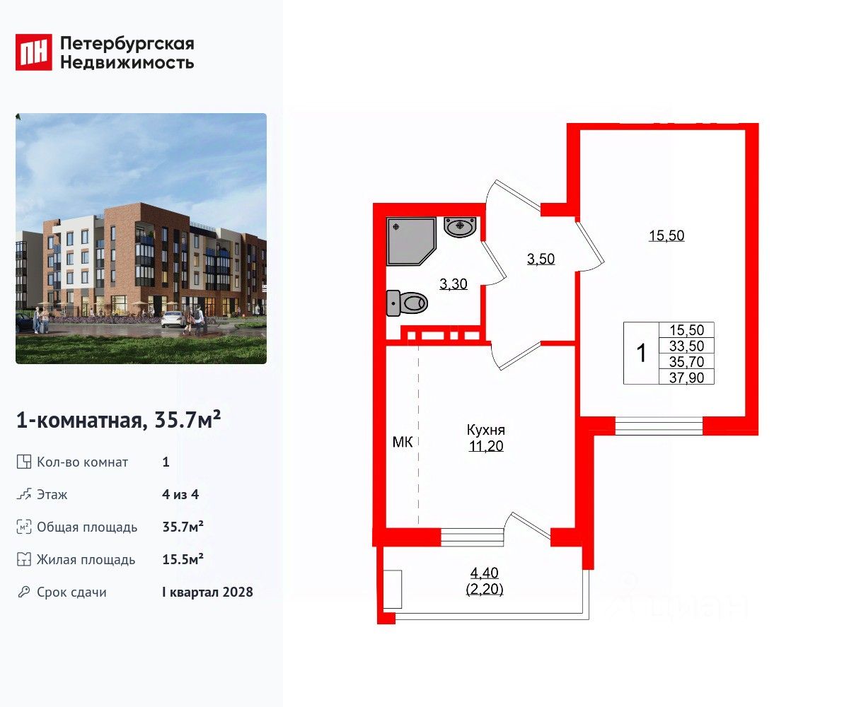 Продается просторная 1-комнатная квартира от застройщика в жилом комплексе "Кроны и Волны" в Зеленоградск.