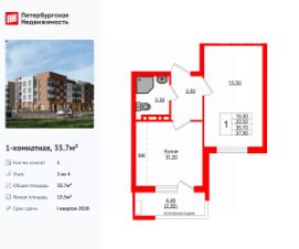 Продается просторная 1-комнатная квартира от застройщика в жилом комплексе "Кроны и Волны" в Зеленоградск.