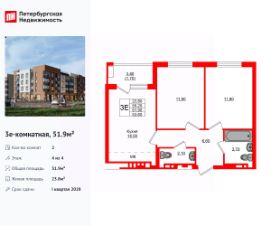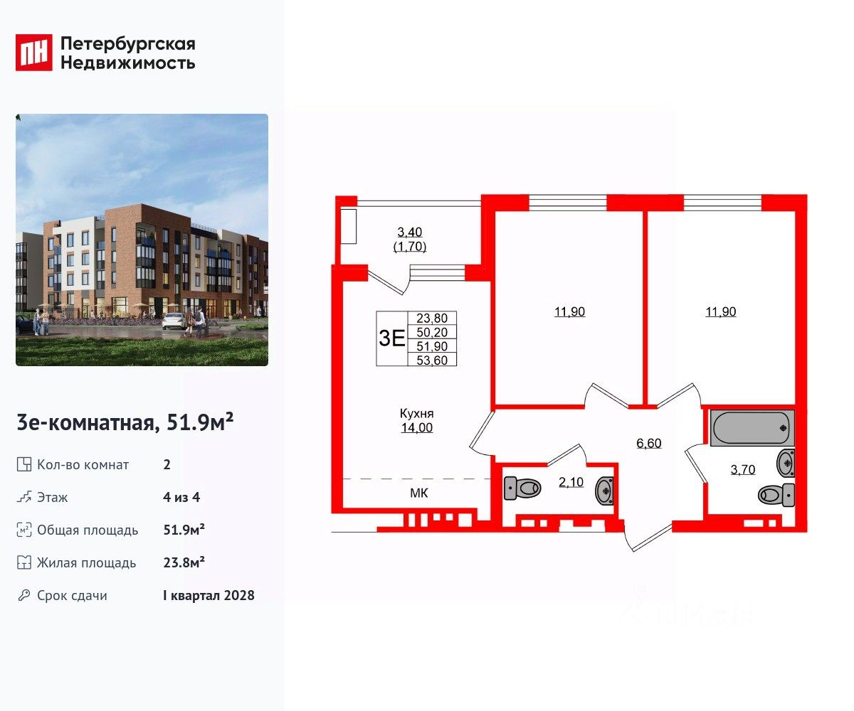 Удобная, классическая, функциональная европланировка, большая кухня-гостиная 14 м², вместительная прихожая 6.6 м². Общая площадь квартиры - 51.9 м², жилая 23.8 м², высота потолка 3 м.
