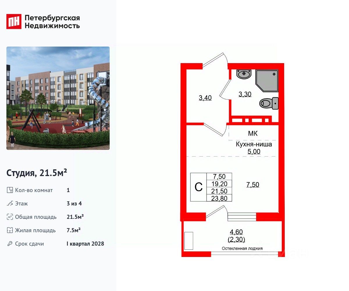 Удобная, классическая, функциональная европланировка, большая кухня-гостиная 5 м², просторная прихожая 3.4 м². Общая площадь студии - 21.5 м², жилая 7.5 м², высота потолка 2.7 м.