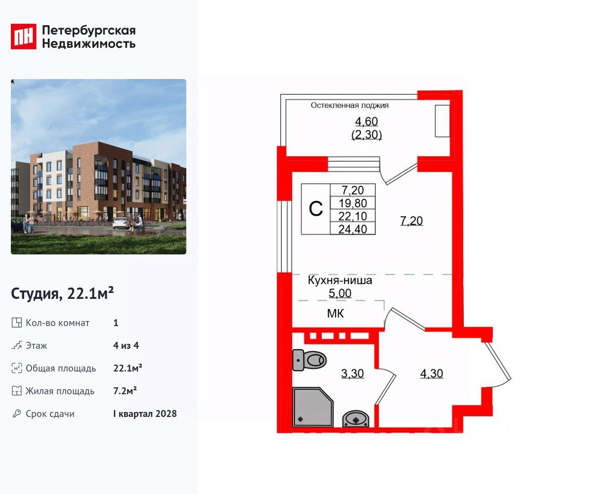 Удобная, классическая, функциональная европланировка, большая кухня-гостиная 5 м², просторная прихожая 4.3 м². Общая площадь студии - 22.1 м², жилая 7.2 м², высота потолка 3 м.