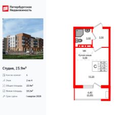 Удобная, классическая, функциональная европланировка, большая кухня-гостиная 5 м², просторная прихожая 3.5 м². Общая площадь студии - 23.9 м², жилая 10.2 м², высота потолка 2.7 м.