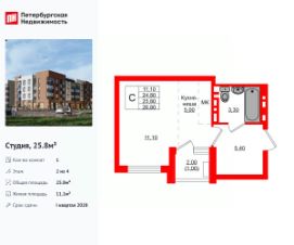 Удобная, классическая, функциональная европланировка, большая кухня-гостиная 5 м², просторная прихожая 5.4 м². Общая площадь студии - 25.8 м², жилая 11.1 м², высота потолка 2.7 м.