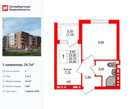 Удобная, классическая планировка, кухня 7.7 м², вместительная прихожая 2.9 м². Общая площадь квартиры - 24.7 м², жилая 9.6 м², высота потолка 2.7 м.