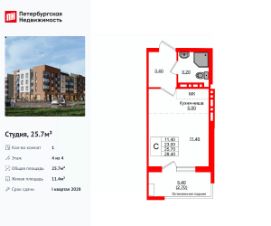 Удобная, классическая, функциональная европланировка, большая кухня-гостиная 5 м², просторная прихожая 3.4 м². Общая площадь студии - 25.7 м², жилая 11.4 м², высота потолка 3 м.