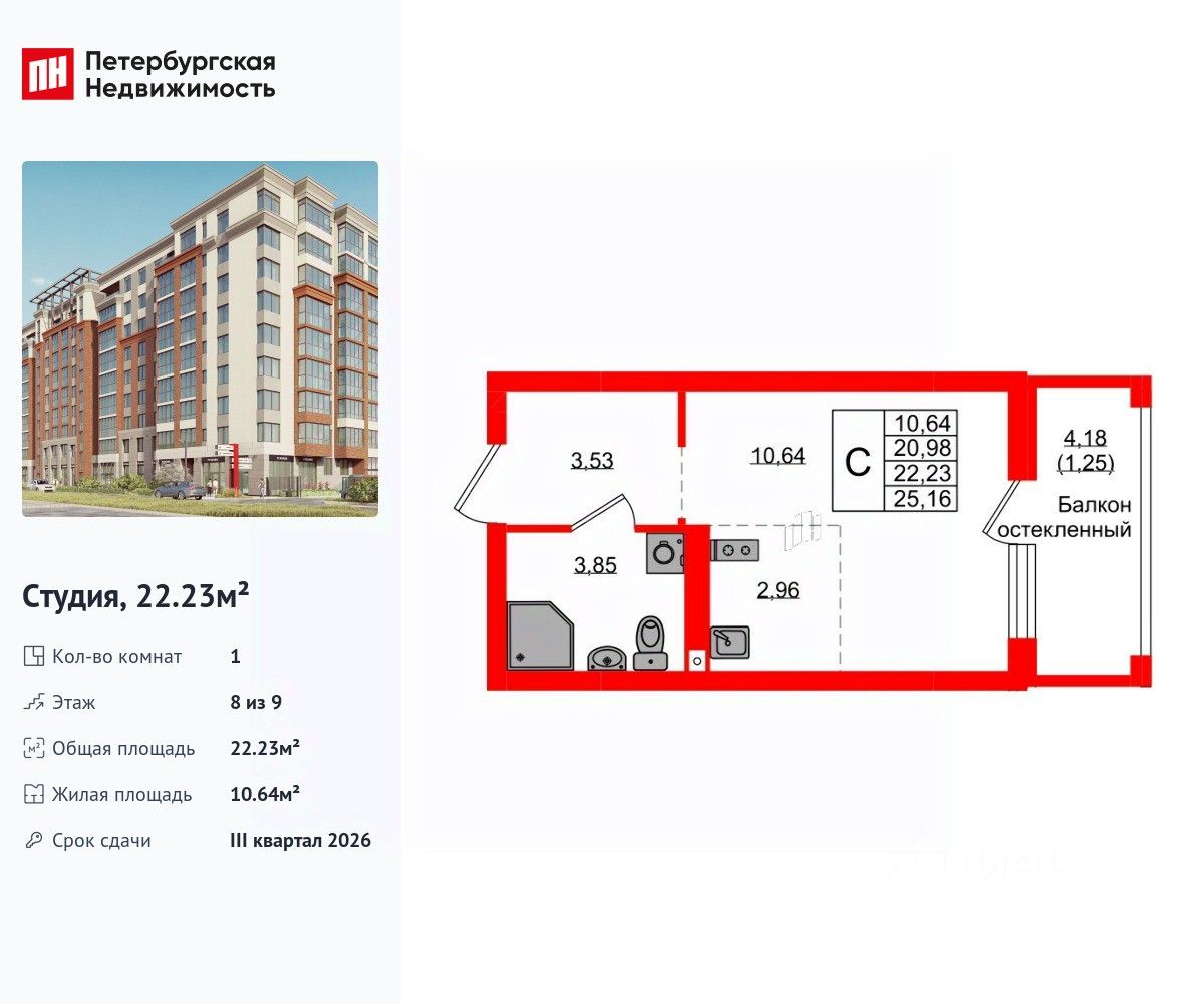 Удобная, классическая, функциональная европланировка, большая кухня-гостиная 2.96 м², просторная прихожая 3.53 м². Общая площадь студии - 22.23 м², жилая 10.64 м², высота потолка 2.7 м.