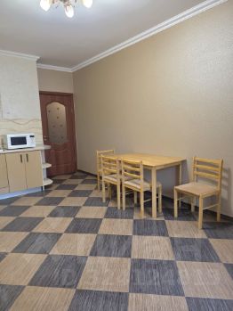 Квартира просторная, с функциональной планировкой, жилая комната площадью 21,5 м кв. Большая кухня (16,1 м кв) с выходом на застекленный балкон, коридор площадью 6,4 м кв с встроенным большим шкафом- купе. Санузел совмещен, 3,9 м кв. Стены и полы в санузле в плитке.