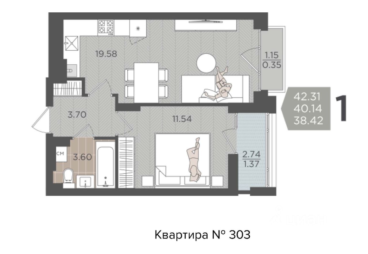 Продаётся уютная однокомнатная квартира площадью 42.3 квадратных метра на девятом этаже нового кирпичного дома 2025 года постройки, расположенного по адресу: Калининград, Батальная улица, 65Б стр. в ЖК "SEVEN"