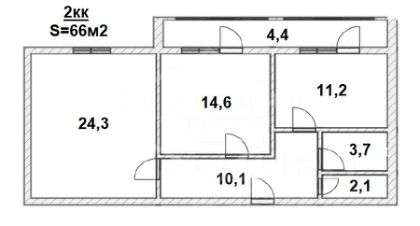 Общая площадь 66 кв м ,жилая комната 14,6 кв м и 24,3. Кухня 11,2 кв м .