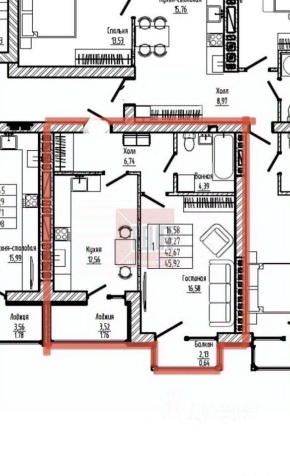 Площадь квартиры 45,92 м² (с лоджией и балконом)