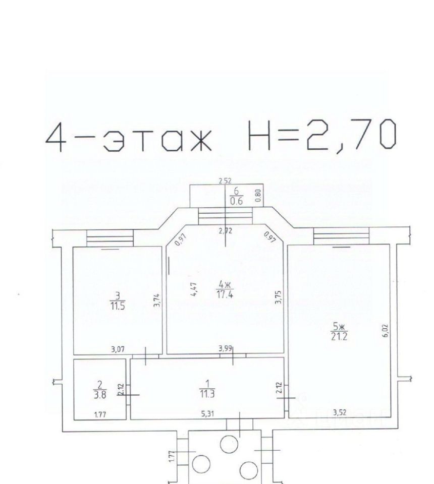 Планировка: две изолированные комнаты (17.4 м² и 21.5 м²), просторная прихожая 11.3 м², кухня 11.3 м², совмещённый санузел 3.8 м²
