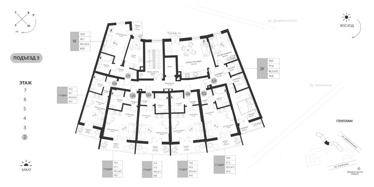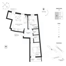 Комплекс состоит из 2-х 7-этажных домов: 126 квартир и 298 квартир На 1-м этаже располагаются коммерческие помещения.
