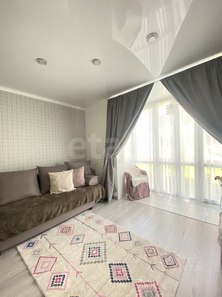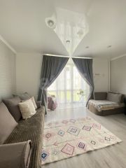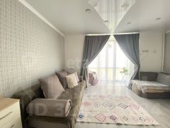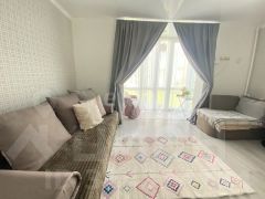 - светлая студия с функциональной зоной кухни и просторной гостиной, лоджией, панорамным остеклением и живописным видом на зеленый двор.