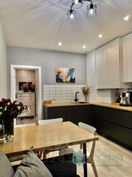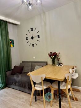 Кухня-гостиная, на которой расположен диван делает квартиру еще более удобной и уютной для семейных посиделок и приятных вечеров в компании друзей. Комната просторная и разделена перегородкой на 2 отдельные зоны.