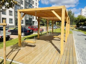 —Современное благоустройство двора с детскими площадками, местами отдыха взрослых, площадка для стрит-бола и занятий спортом, обустроенная площадка для выгула собак.
