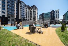 Современная детская игровая и спортивная площадки с безопасным покрытием.