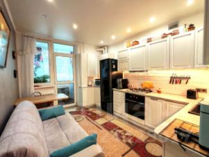 • Кухня: Функциональная кухня (12.4 кв.м) с современным кухонным гарнитуром и выходом на застекленную лоджию (2.2 кв.м), которую можно использовать как мини-кабинет