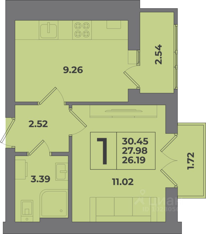 Общая площадь30,45 м²