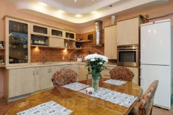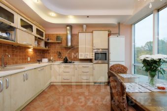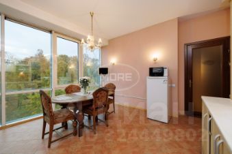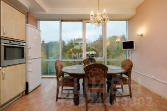 Кухня почти 20 м2 при высоте потолков 3 метра, с окнами в пол и видом на прекрасный лесной массив. Рабочая зона оборудована гарнитуром и встроенной техникой. По центру кухни стоит стол из массива дерева, за которым с легкостью соберется вся Ваша большая семья.