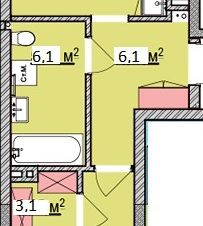 Общая площадь квартиры 58,73 кв.м, площадь кухни-гостиной 22,4 кв.м., комнаты 15,1 кв.м., гардеробная 3,1 кв.м., с/у 6,1 кв.м., коридор 6,1 кв.м. Две застеклённые лоджии 4,5 кв.м. + 1,43 кв.м.