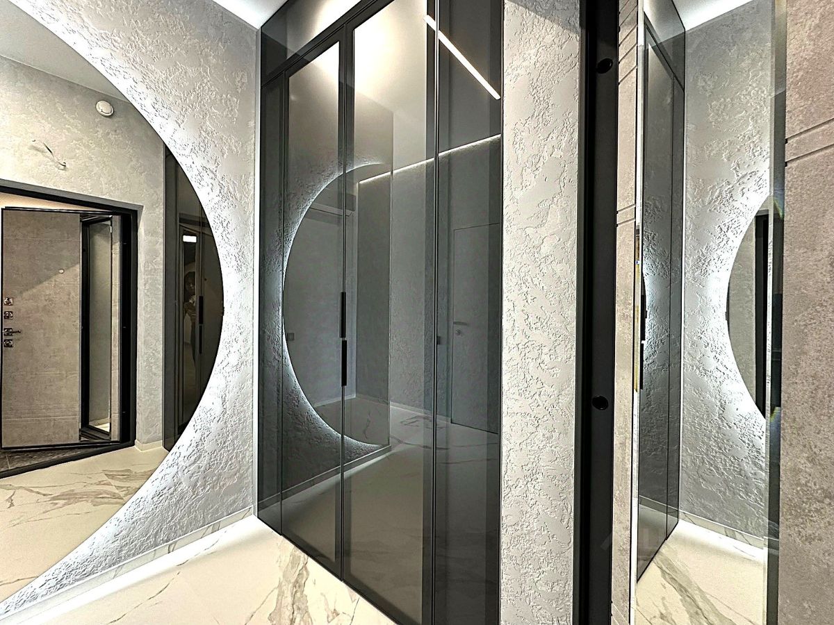 Гардеробная выполнена по индивидуальному заказу из стекла высокой прочности.