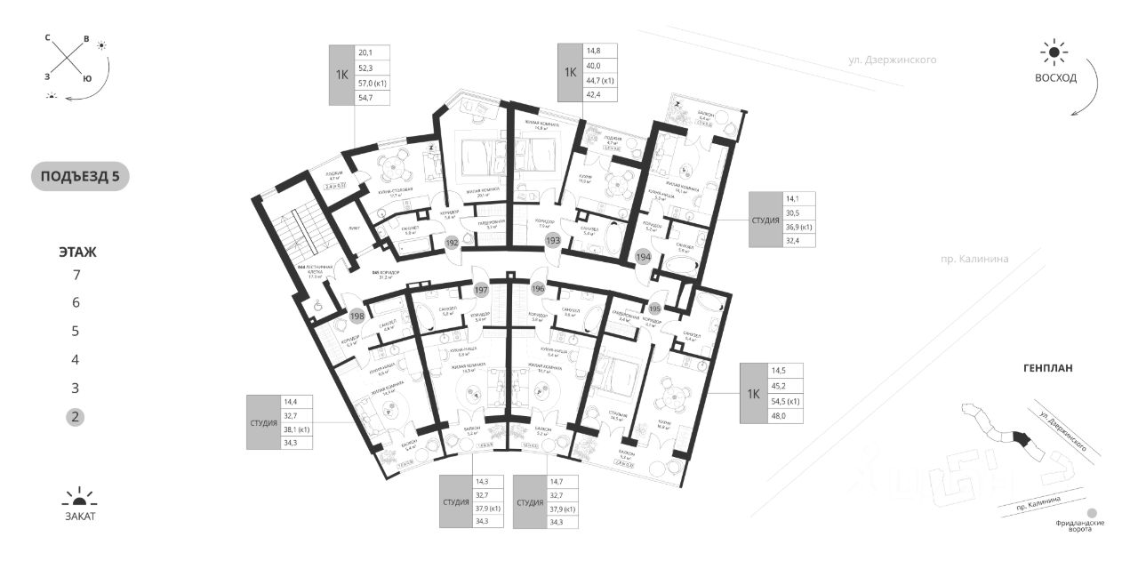 Комплекс состоит из 2-х 7-этажных домов: 126 квартир и 298 квартир На 1-м этаже располагаются коммерческие помещения.