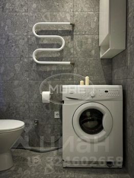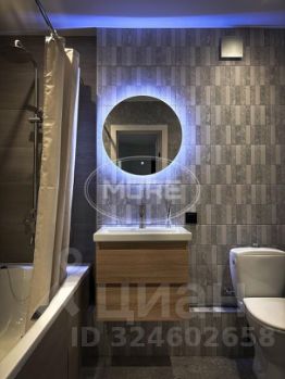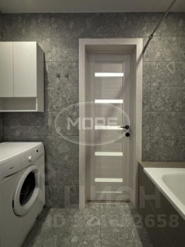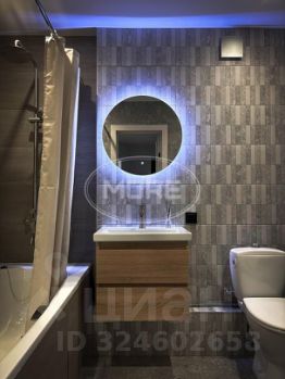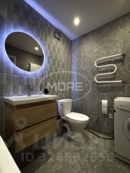 Санузел может показаться небольшой по площади, но вмещает в себя все необходимое и на деле ощущается очень просторным. В санузле размещена ванна, тумба для хранения с раковиной, зеркало с подсветкой, стиральная машина, унитаз и подвесной шкаф для хранения домашней утвари